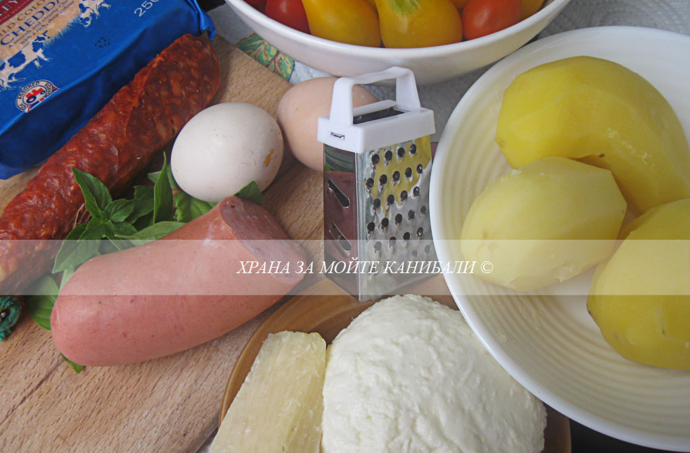 * Така приготвен се поставя на средна скара в загрятата вече фурна и пече около 12-15 мин. - до зачервяване на картофения блат по краищата. През това време се подготвят сирената и колбасите за гарниране.